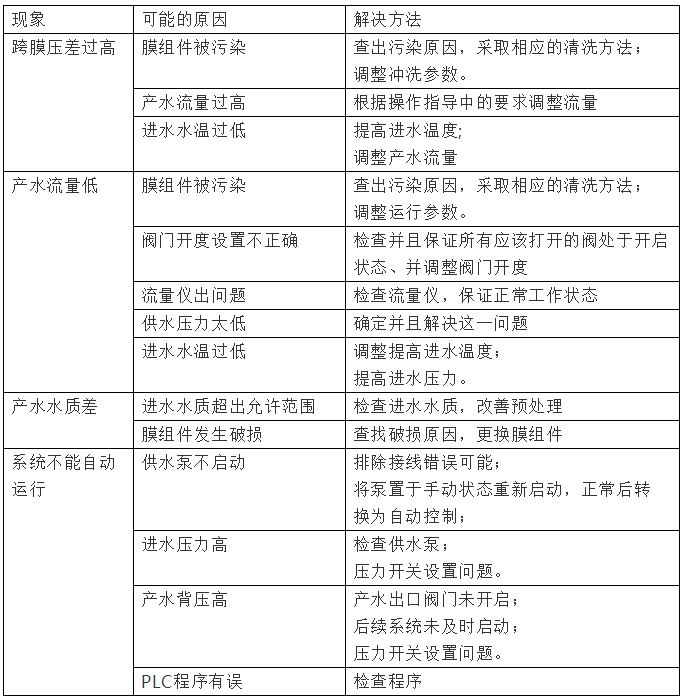 導(dǎo)致超濾系統(tǒng)故障的原因,可能來(lái)自于超濾系統(tǒng)本身,也可能來(lái)自于預(yù)處理系統(tǒng)、加藥系統(tǒng)、電儀系統(tǒng)和或者控制系統(tǒng)等,根據(jù)超濾系統(tǒng)出現(xiàn)故障類(lèi)型和位置,通常可以確定故障的起因,針對(duì)不同的原因可以采取對(duì)應(yīng)的糾正措施進(jìn)行排除。