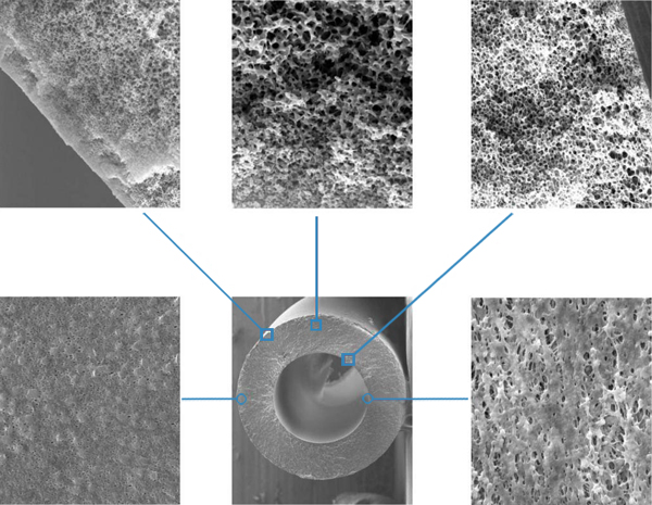 》出水水質(zhì)穩(wěn)定 ? 表面公稱孔徑0.03μm,PVDF材料膜中篩分孔徑最小廠家之一; ? 膜絲組成由致密層與支撐層雙層結(jié)構(gòu),截留率高; ? 親水改性技術(shù),大大提高抗污能力。 |